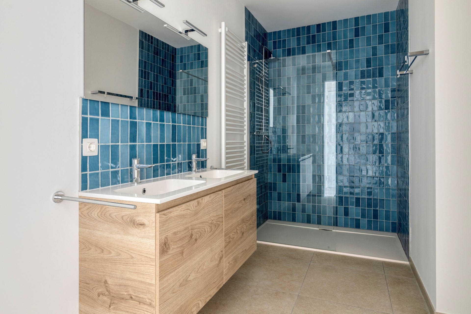 - Badkamer met ruime inloopdouche en dubbele wastafel.