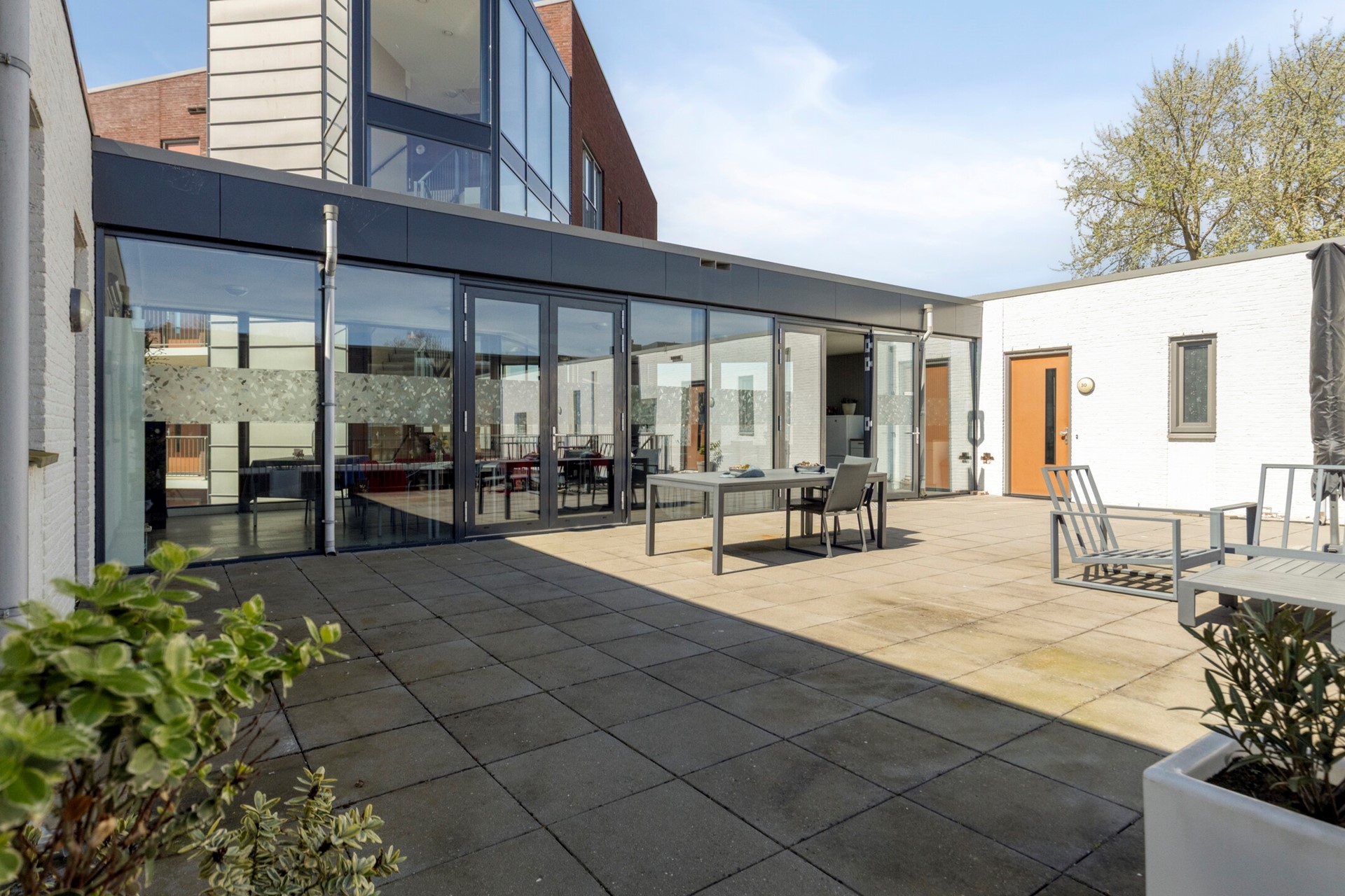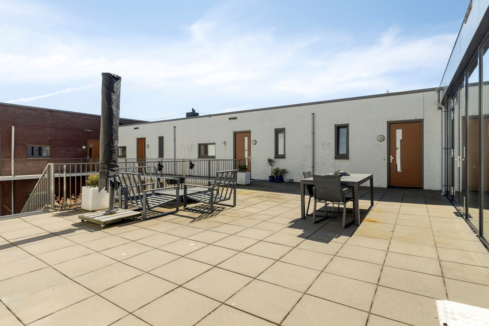 Boven de fietsenberging is een groot "inpandig" buitenterras met tuinmeubilair dat ter beschikking is voor alle bewoners en hun bezoek én er is mogelijkheid om (in overleg met de VvE ) gebruik te maken van een gemeenschappelijke binnenruimte.