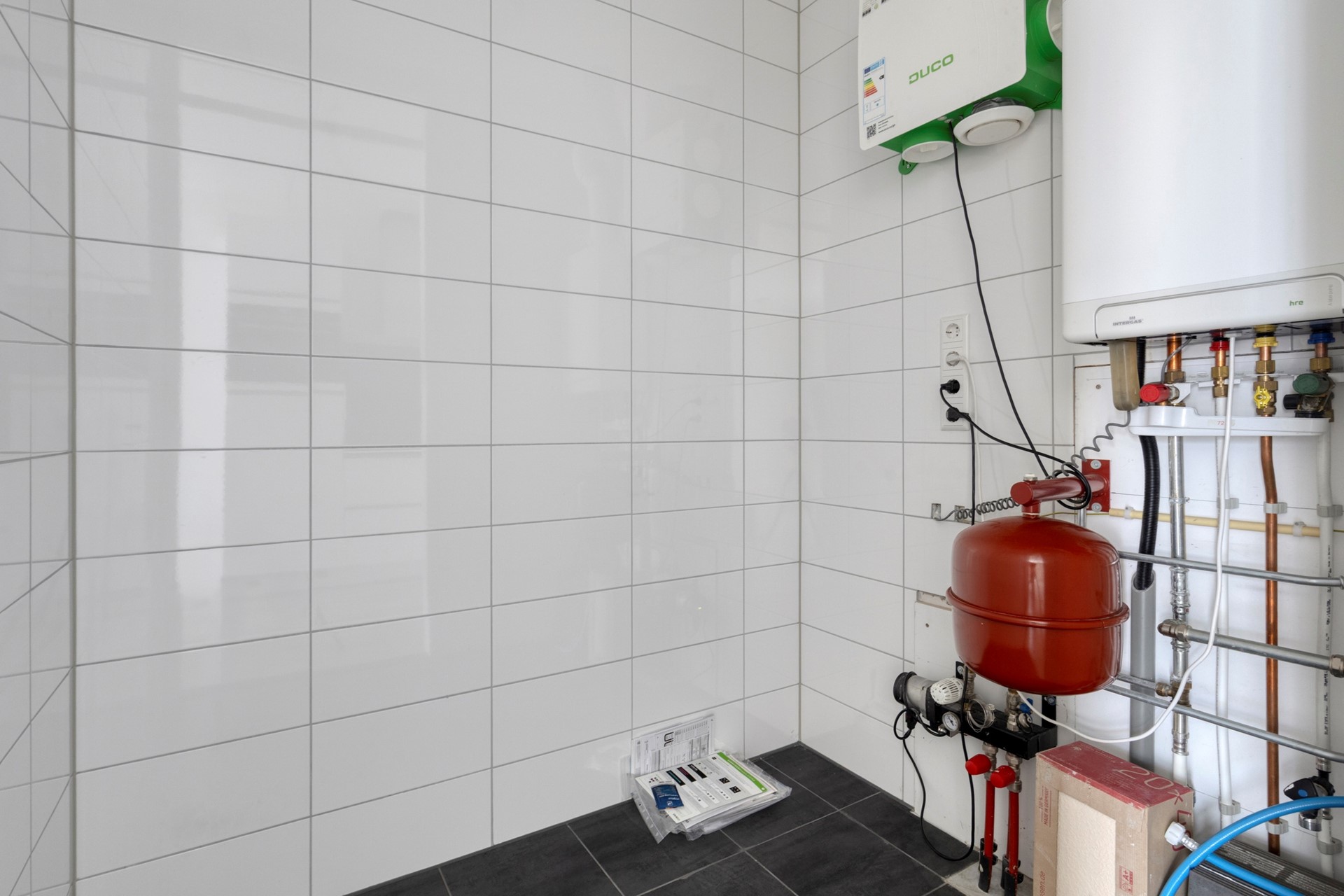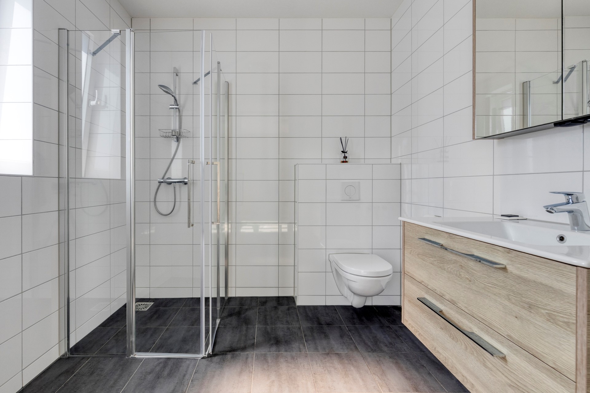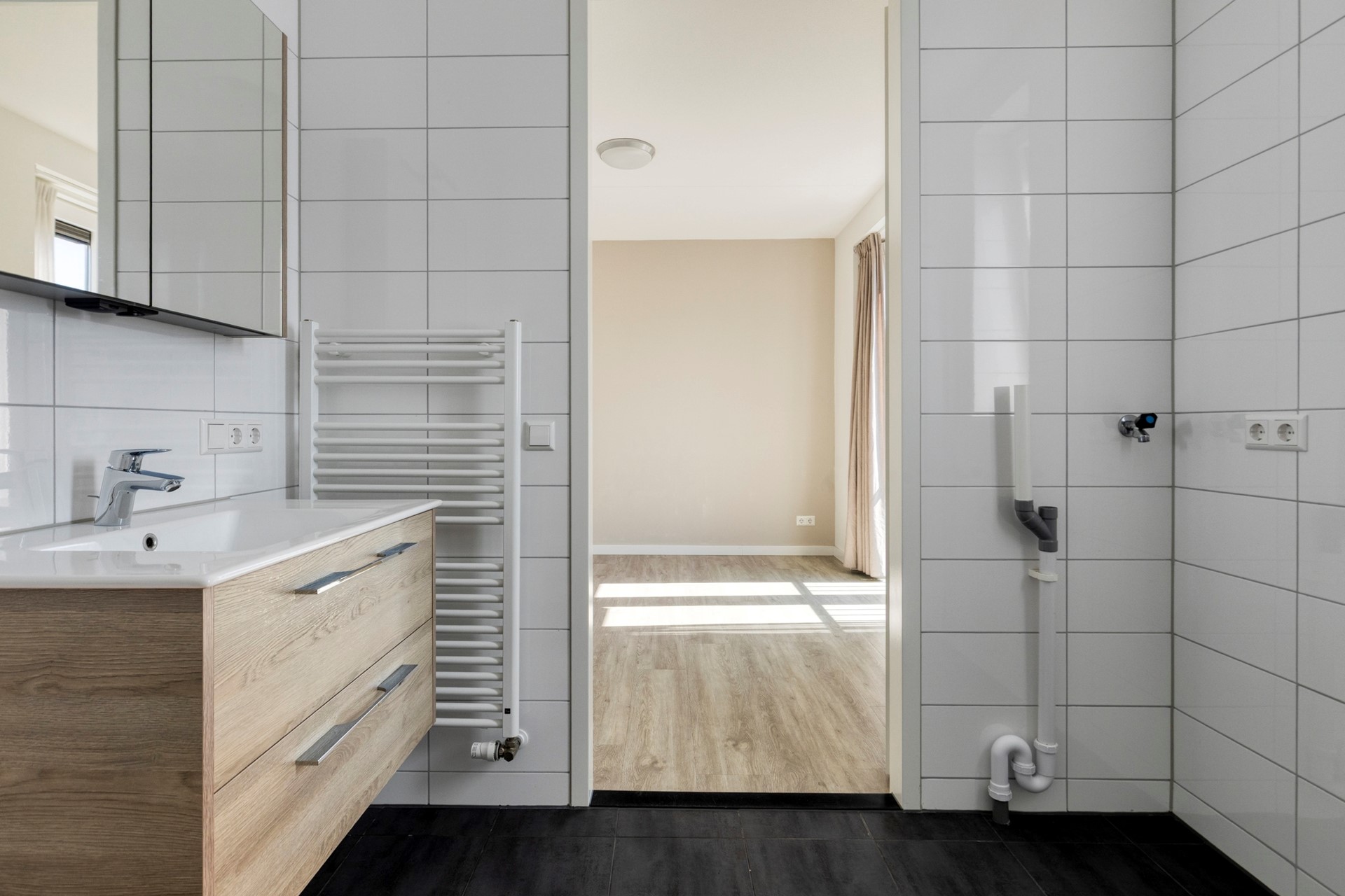 De badkamer is compleet uitgerust met een douche, wastafelmeubel, toilet en wasmachineaansluiting en is geheel betegeld.